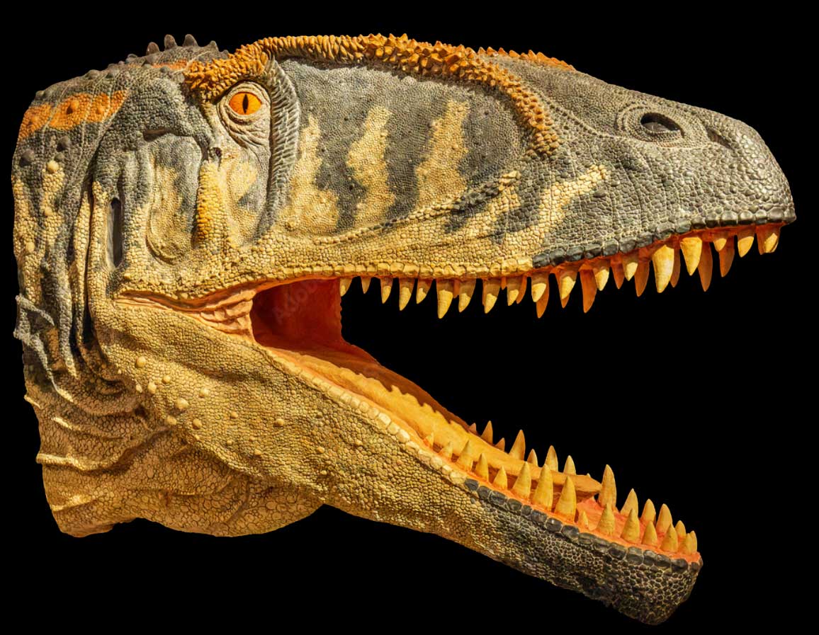 Called "shark-toothed" for its blade-shaped teeth, Carcharodontosaurus sliced its prey to pieces. Its skull is narrow side to side, with swollen brows protecting each eye socket.